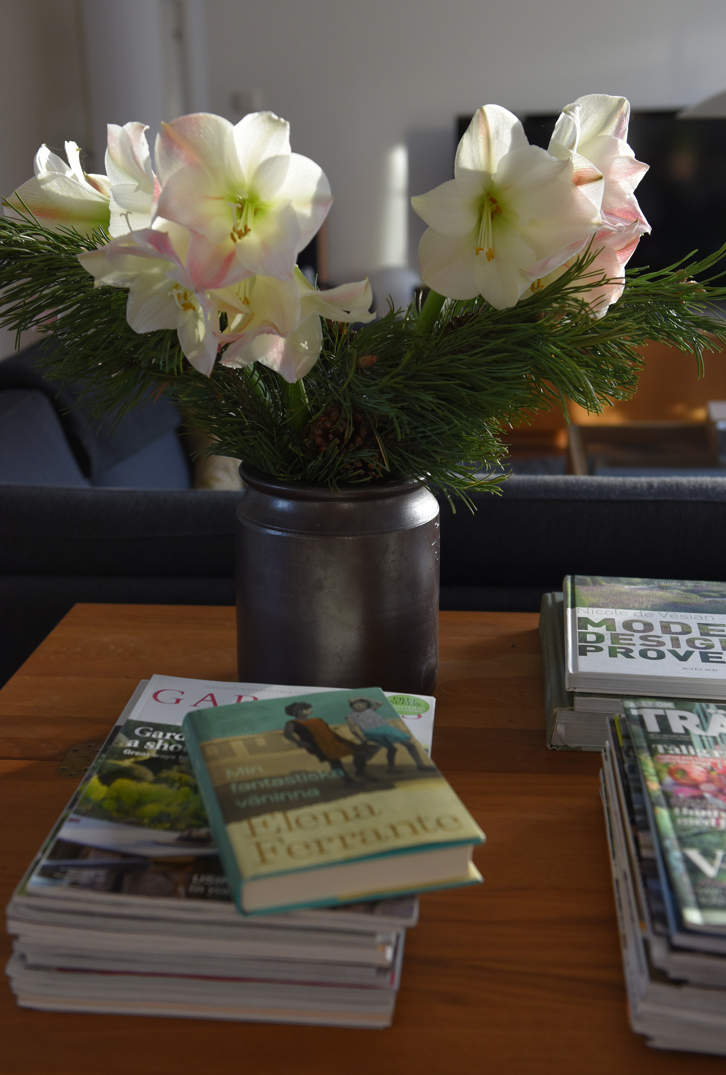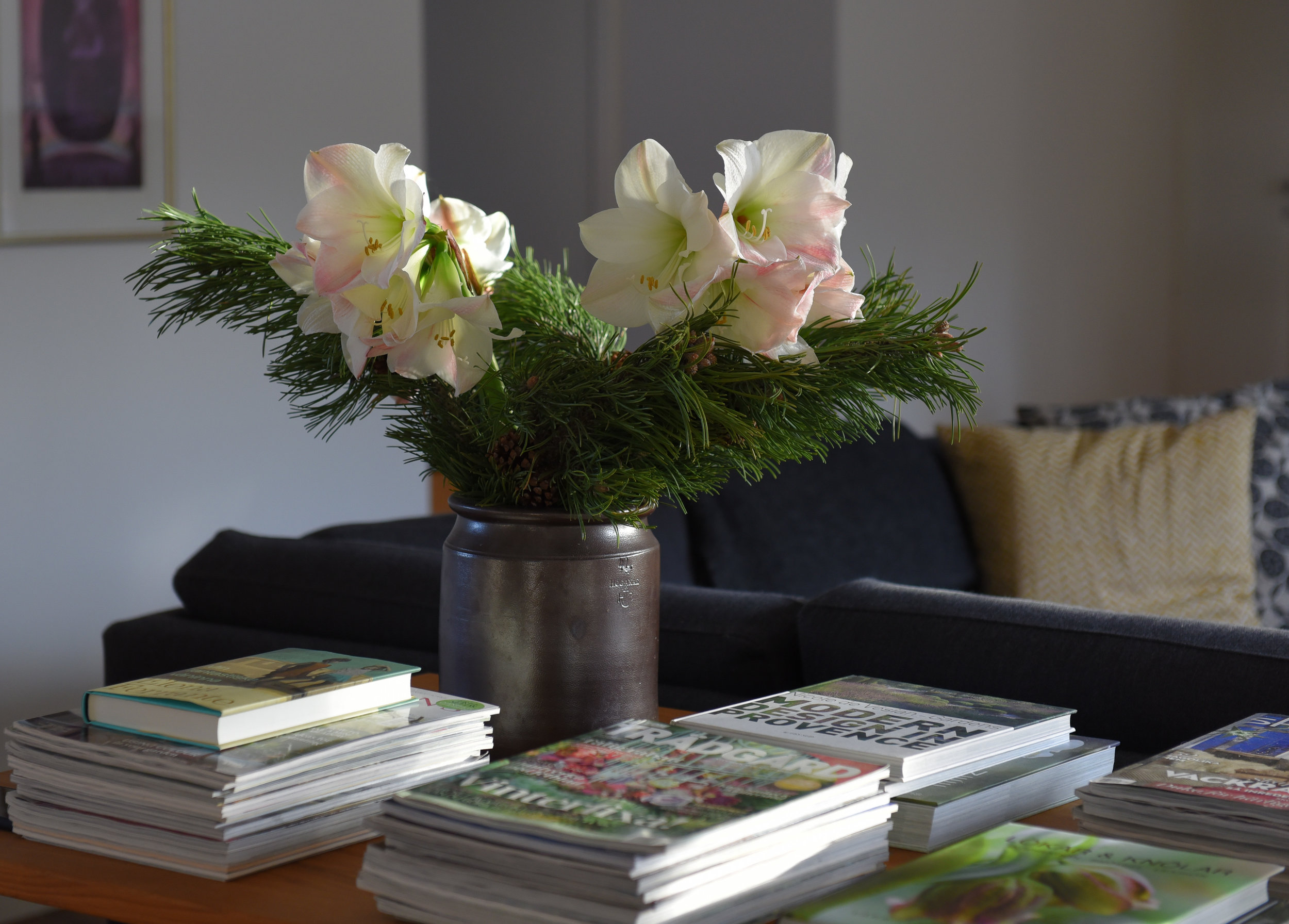 Så var en jättehärlig nyråsafton och nyrårsdag över. Idag kickar jag igång 2017 bla med ett nytt projekt. Spännande. Amaryllis 'Apple Blossom' har blommat länge, länge och är helt underbar. Här tillsammans med tallris i ett gammalt Höganäskärl.