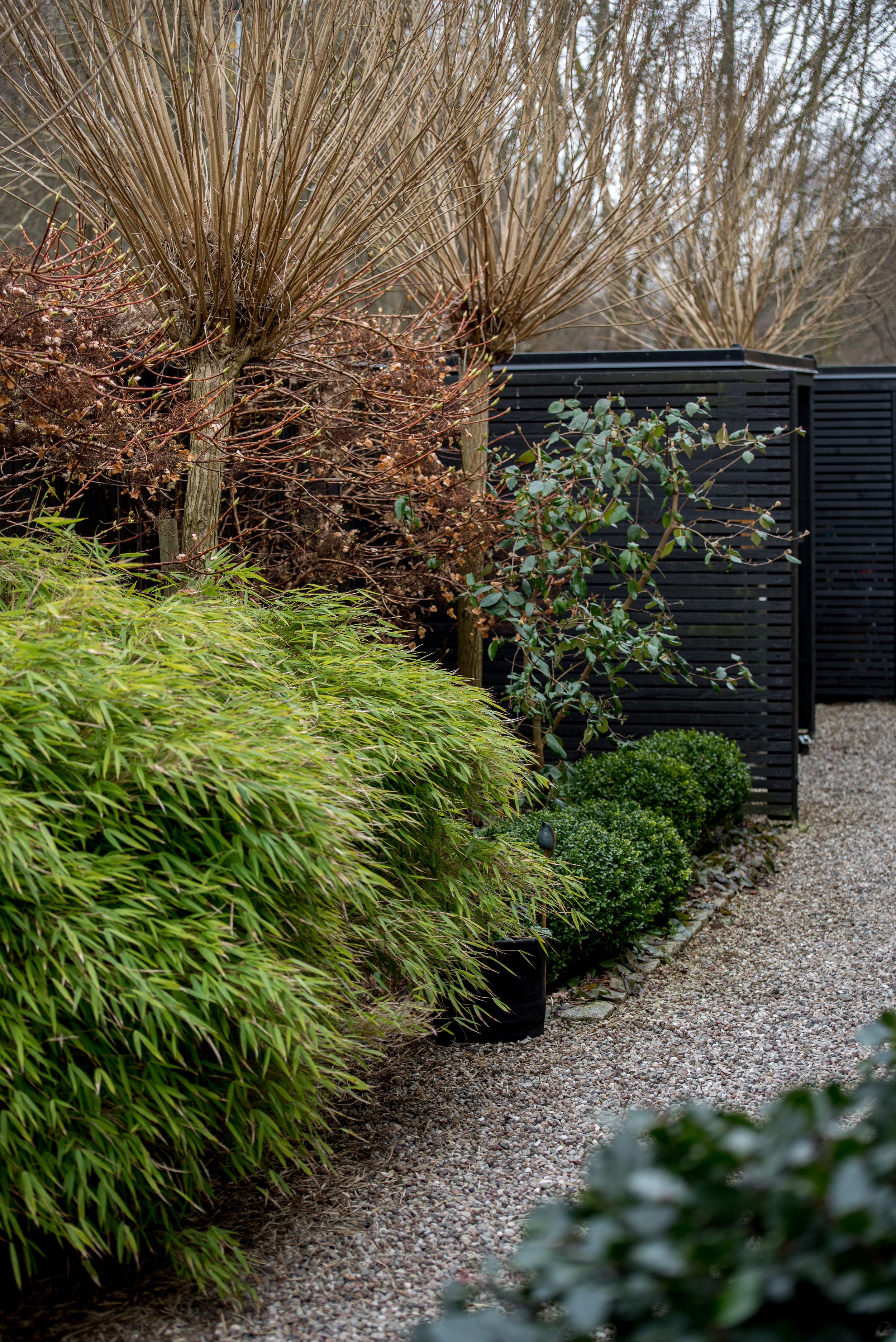 Entrésidan idag. Svart, grön och lite kopparfärgad. Olvonbuskarna har massor av blomknoppar och klätterhortensians knoppar brister snart.