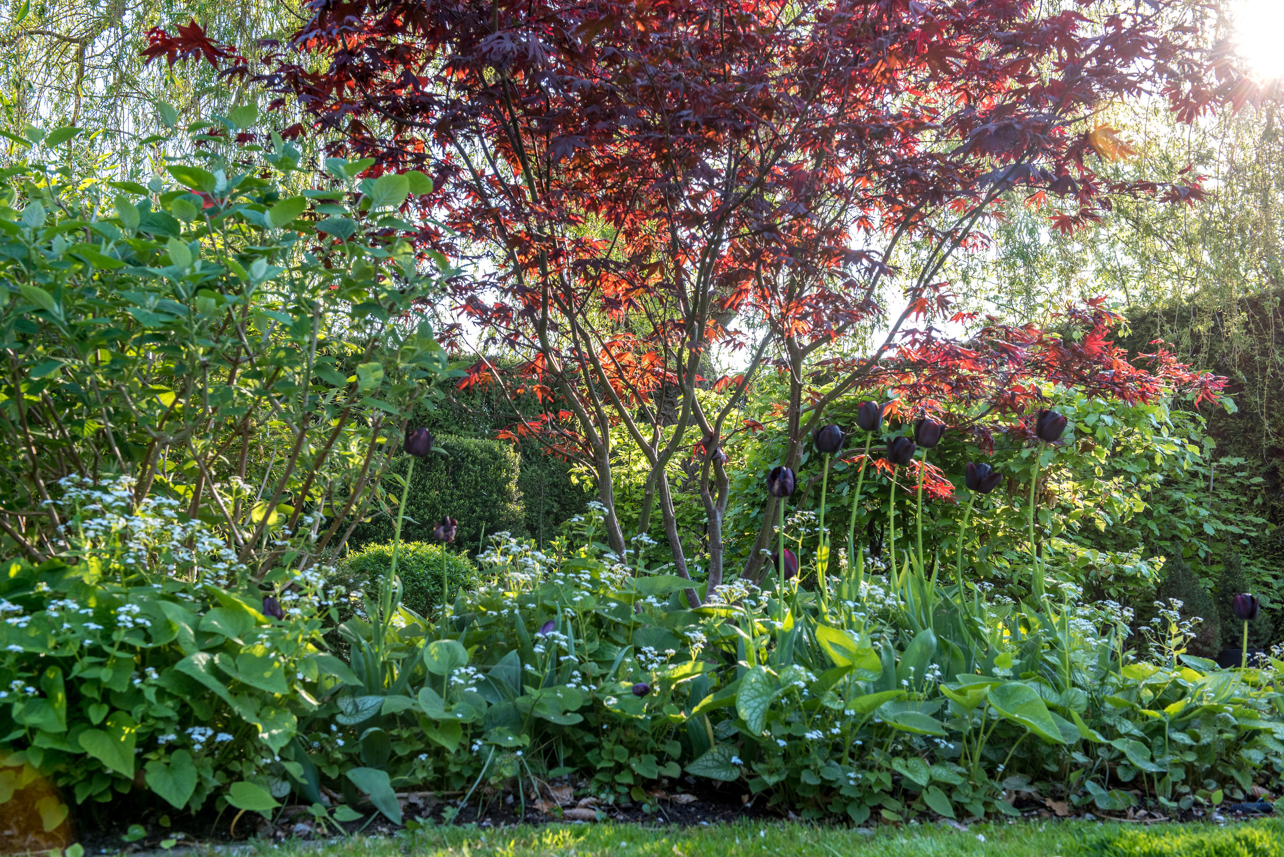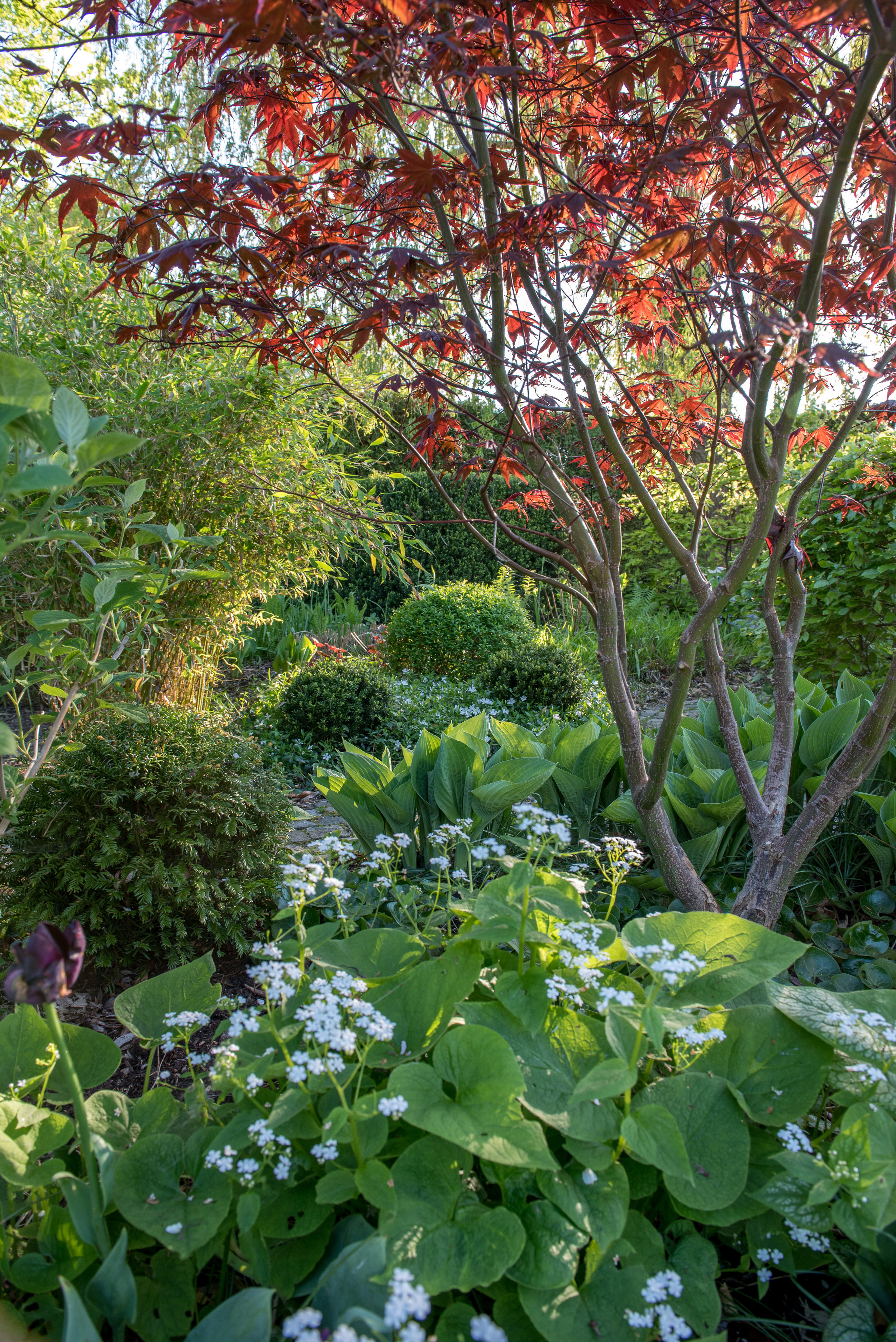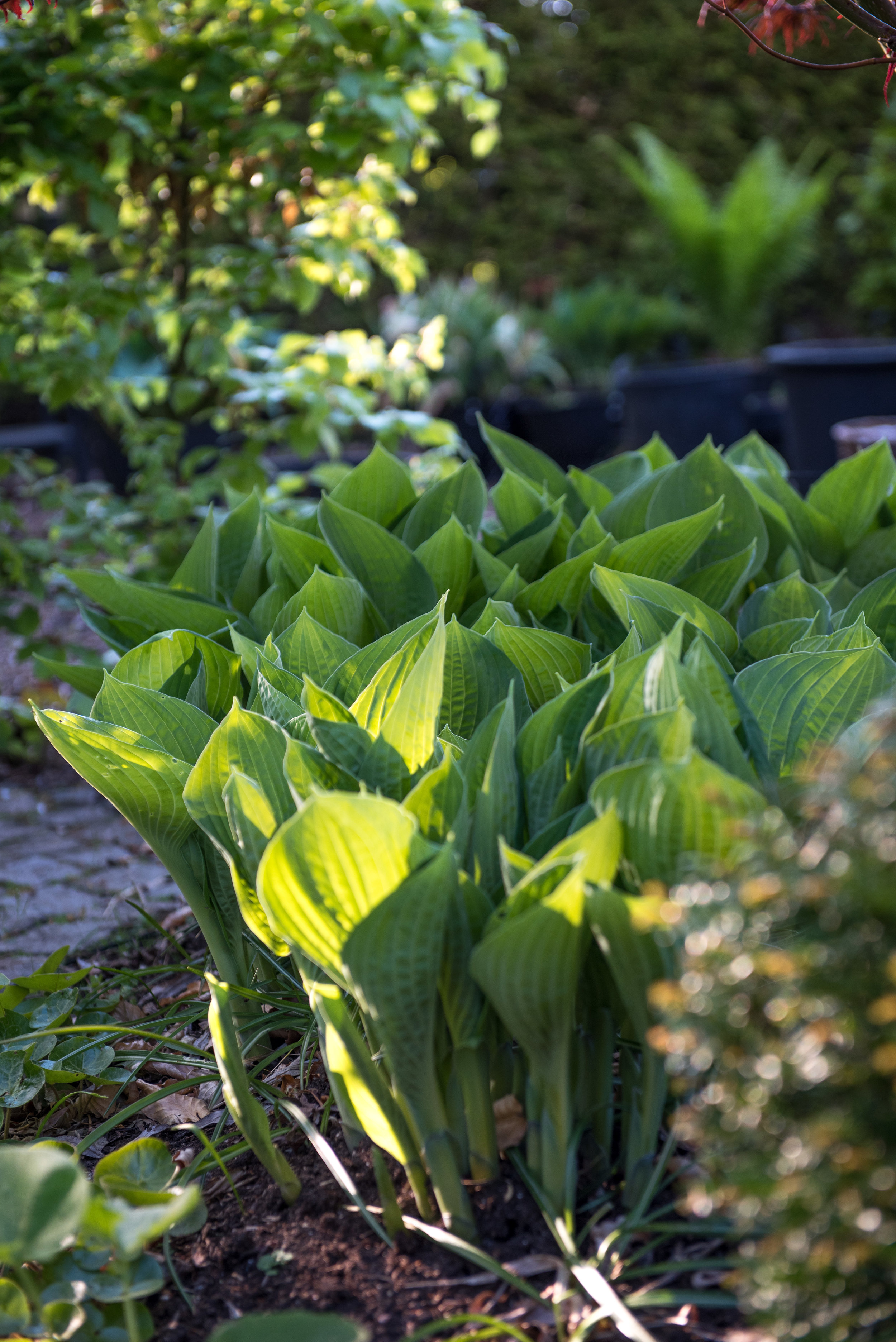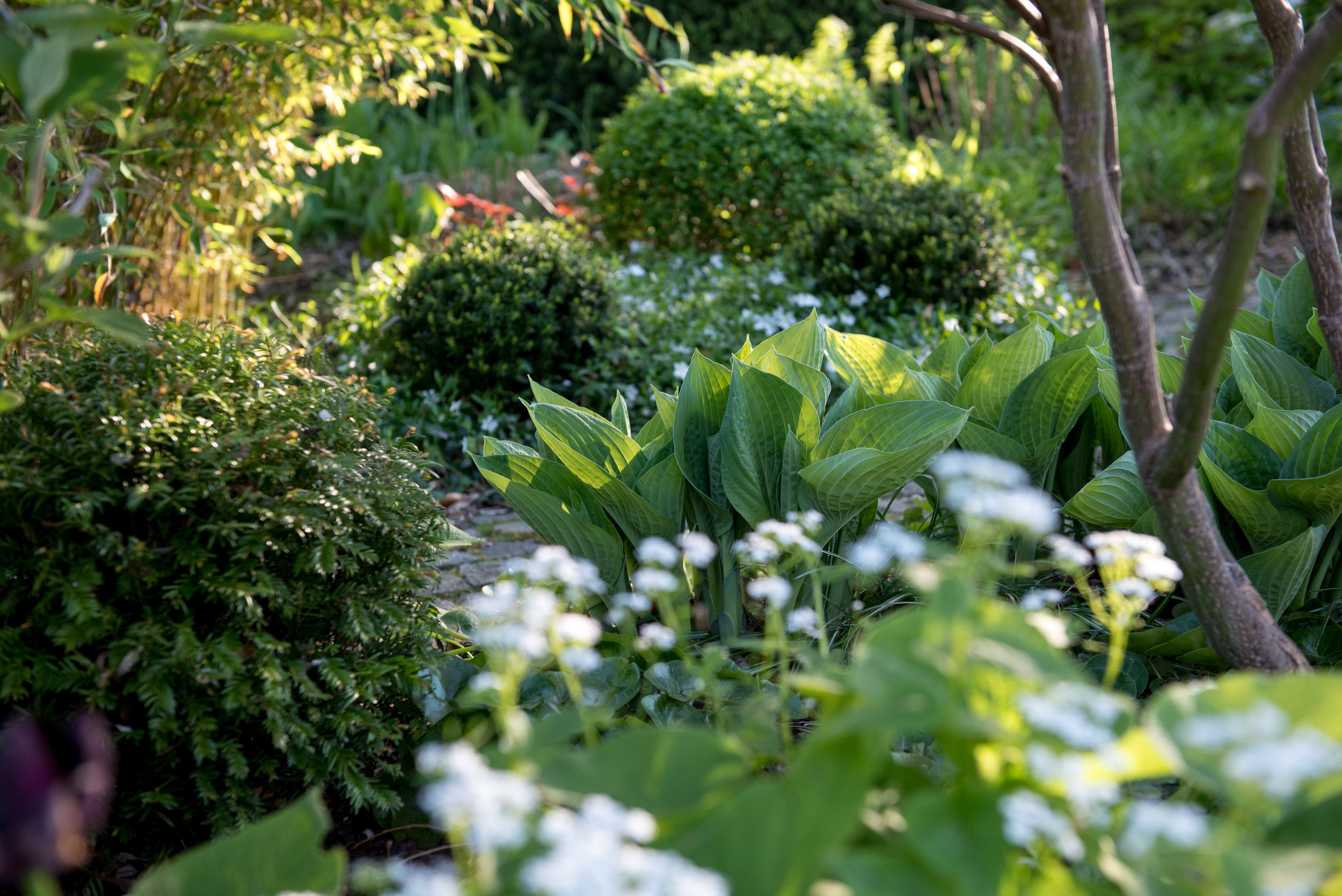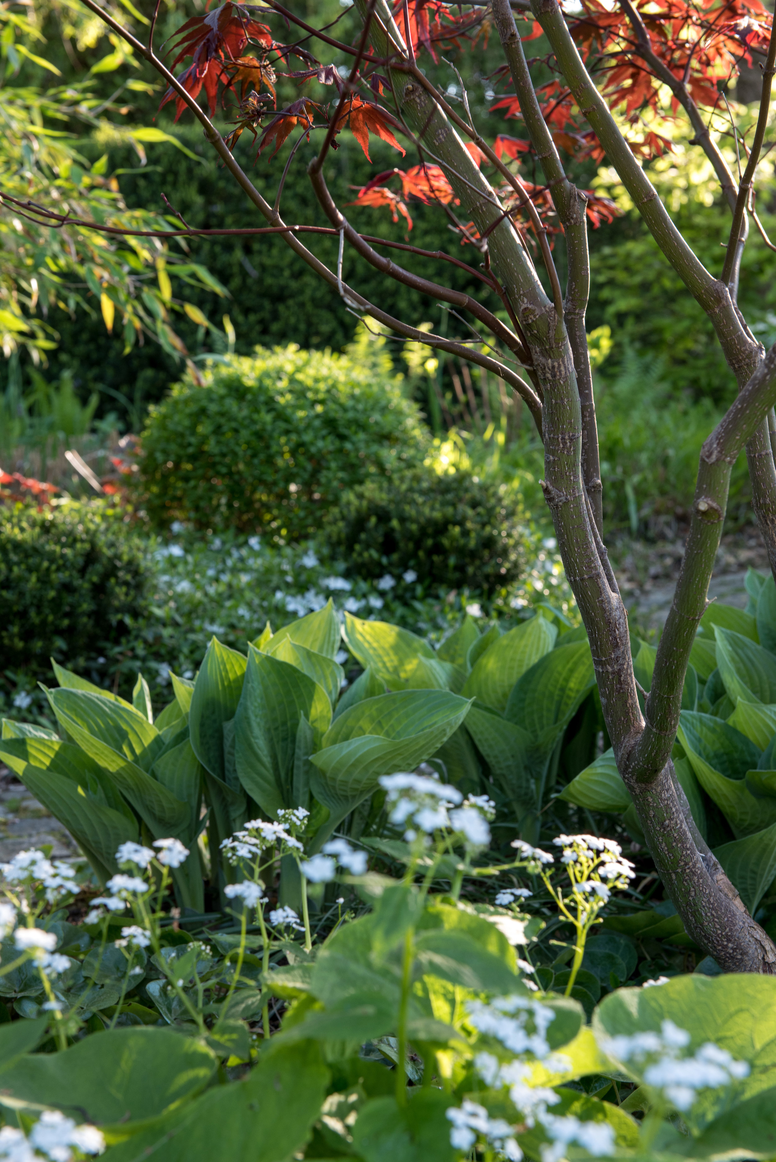 Alltså maj månad är ju bara sagolikt vacker. Jag fullständigt älskar hostorna i detta stadiet. Här är det hosta 'Gold Standard' som är på väg upp. Nu håller jag tummarna för att sniglar och snäckor håller sig i skinnet. I förgrunden vit kaukasisk förgätmigej 'Mr Morse'. Kloten är av idegran och liguster och som marktäckare i bakgrunden är det vit vintergröna, vinca minor 'Alba'.