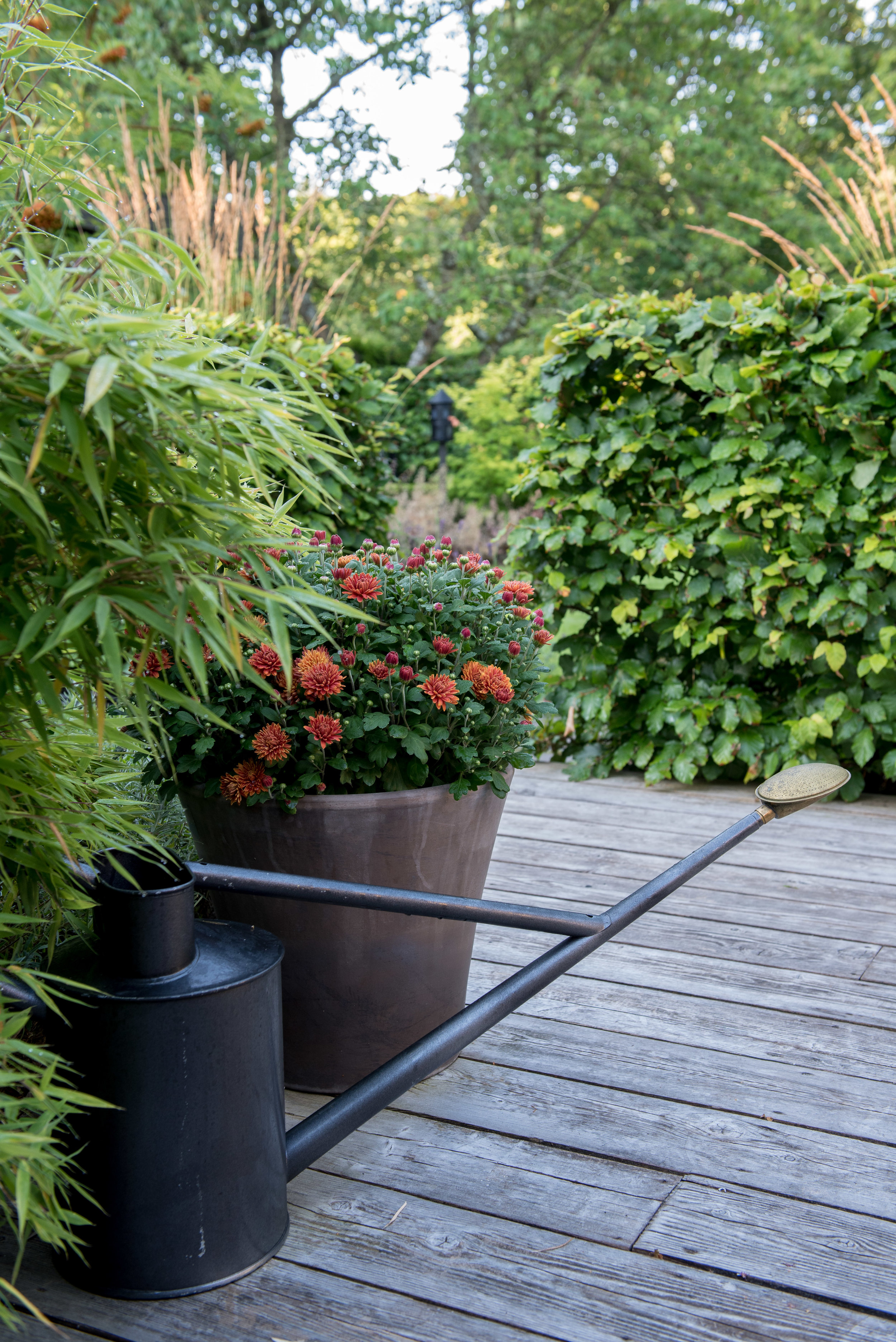 Krysantemumbollar. I trädgårdsvärlden har de kanske en tråkstämpel och anses banala, men jag gillar dem. Tycker man får mycket färg och blomma för pengarna. Just denna köpte jag på BIlka (i Danmark) för ynka 29 DKK. Där köpte jag också krukan.