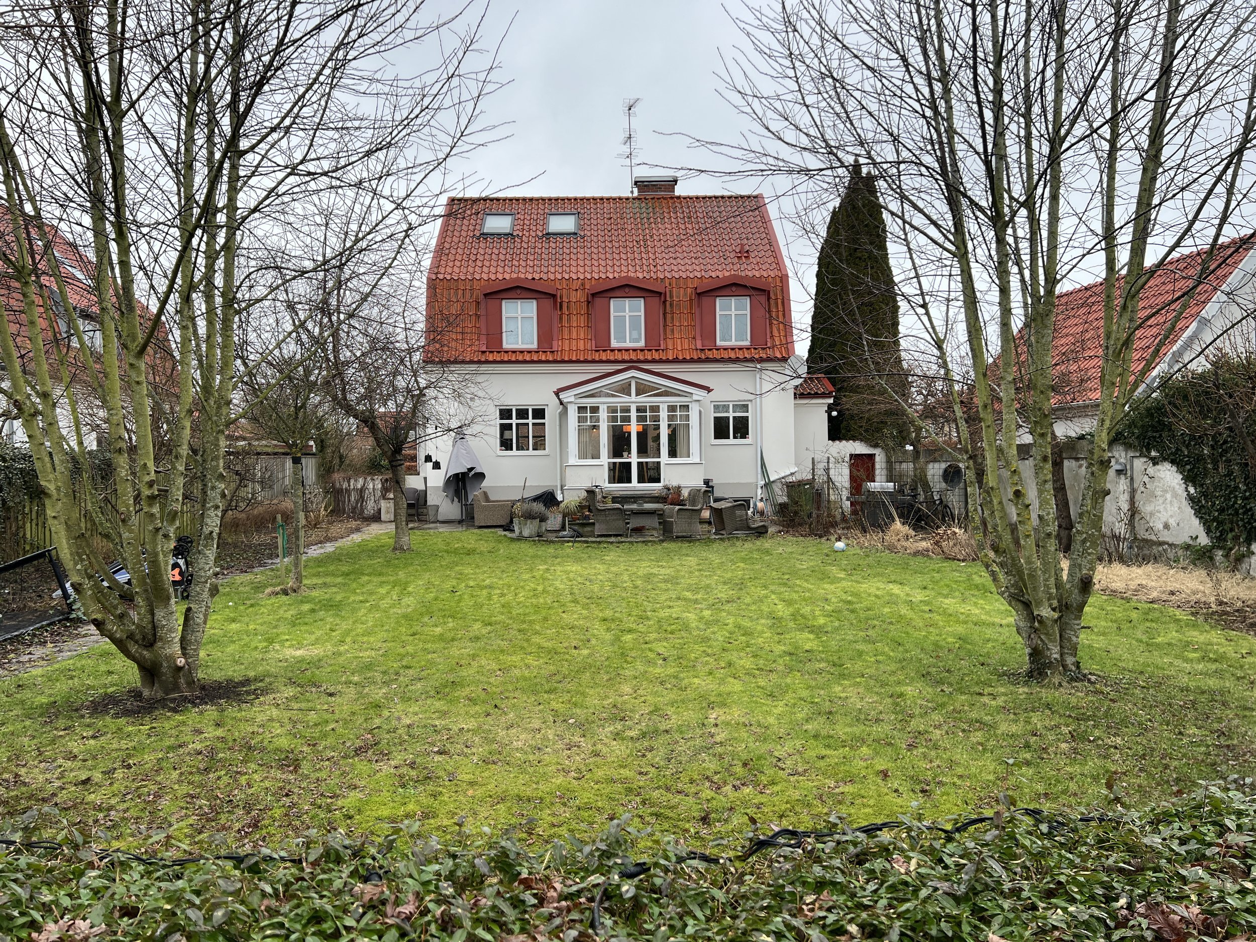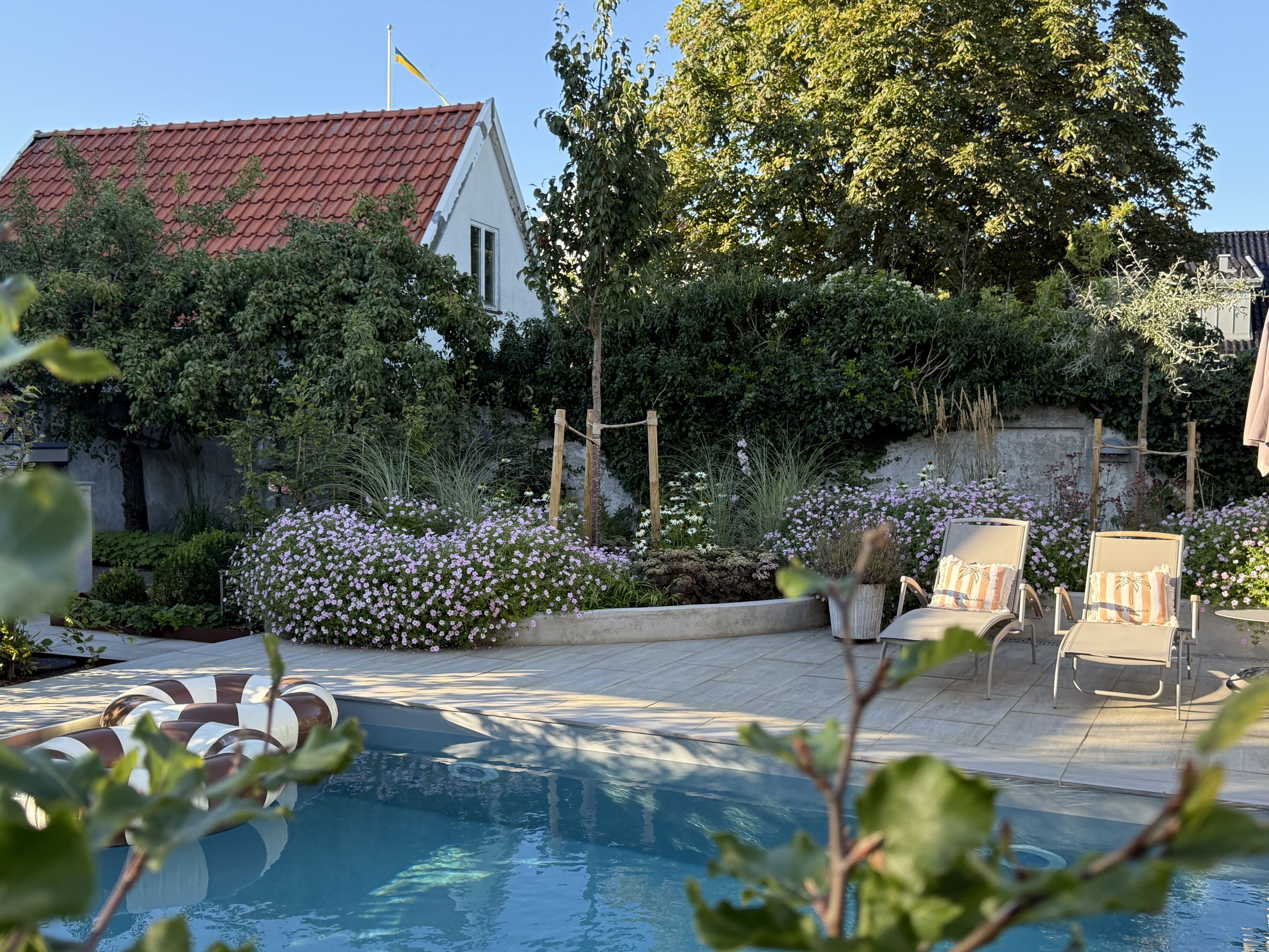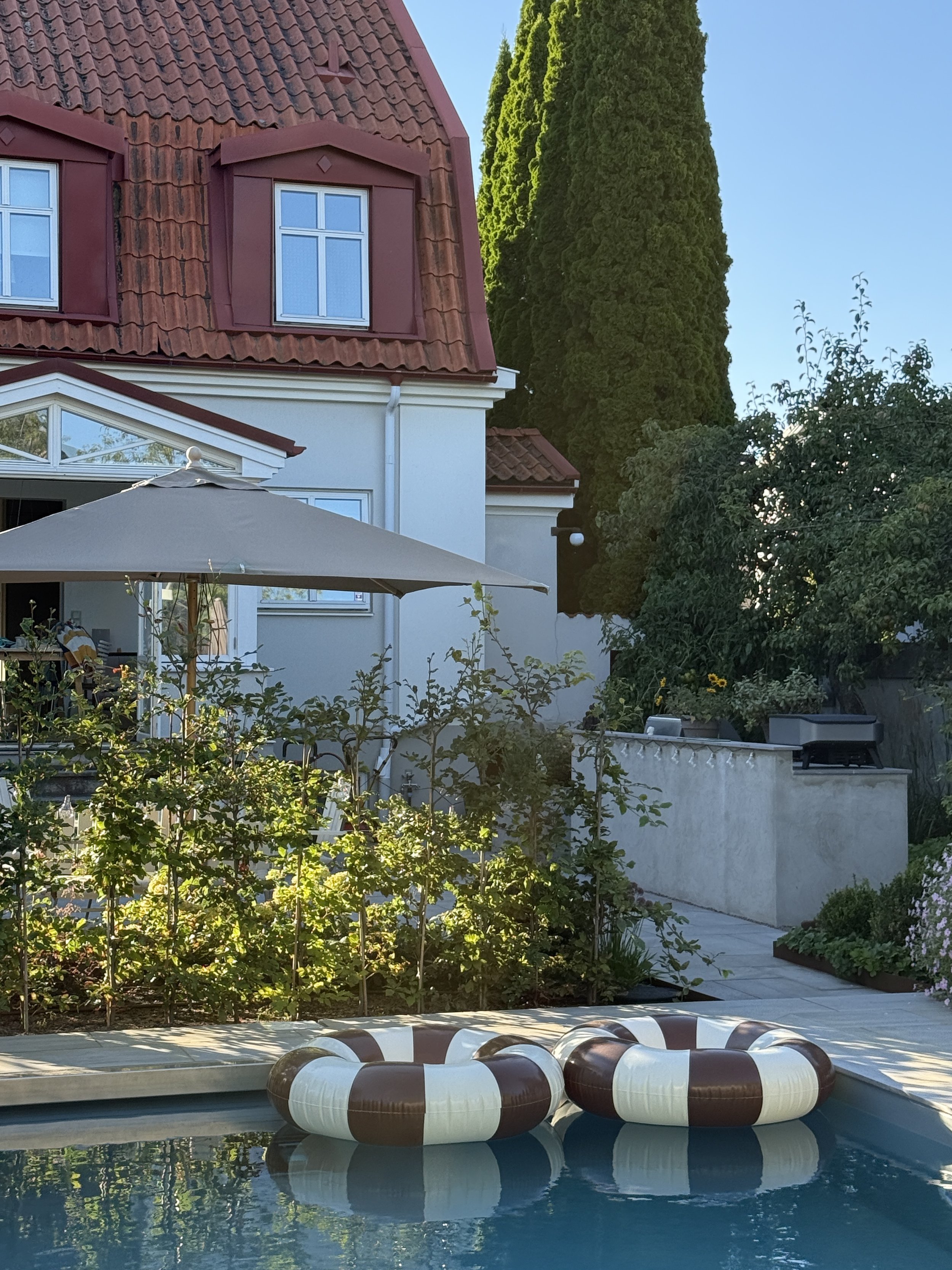 Önskan från mina kunder var en trädgård att umgås i samtidigt som den är grön och härlig att vistas i. Det fanns önskan om en pool, ett utekök, en pergola, någon form av upphöjda bäddar och att kunna plocka buketter från vår till höst. Huset är byggt på 30-talet och det är viktigt att trädgården, trots alla moderniteter, funkar tillsammans med huset.