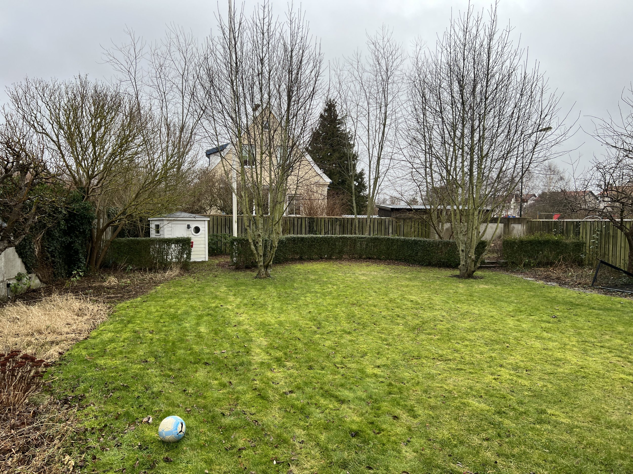 Till vänster bakom bokhäcken finns en bit gräsmatta med fruktträd och plats för hängmatta och kubbspel.