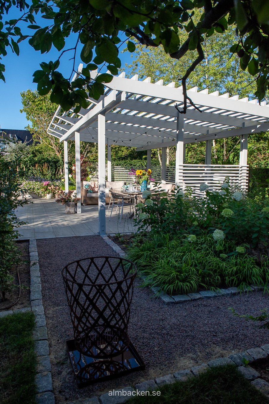 Min son, Nils Dremo, som snart är färdig arkitekt anlitades till att rita pergolan. Den är konstruerad så att om man vill ha ett tätt tak så kan man enkelt lägga på plexiglasskivor. Pergolan är lätt och elegant, men också lite kaxig. Den tar för sig och är ett smycke i trädgården.